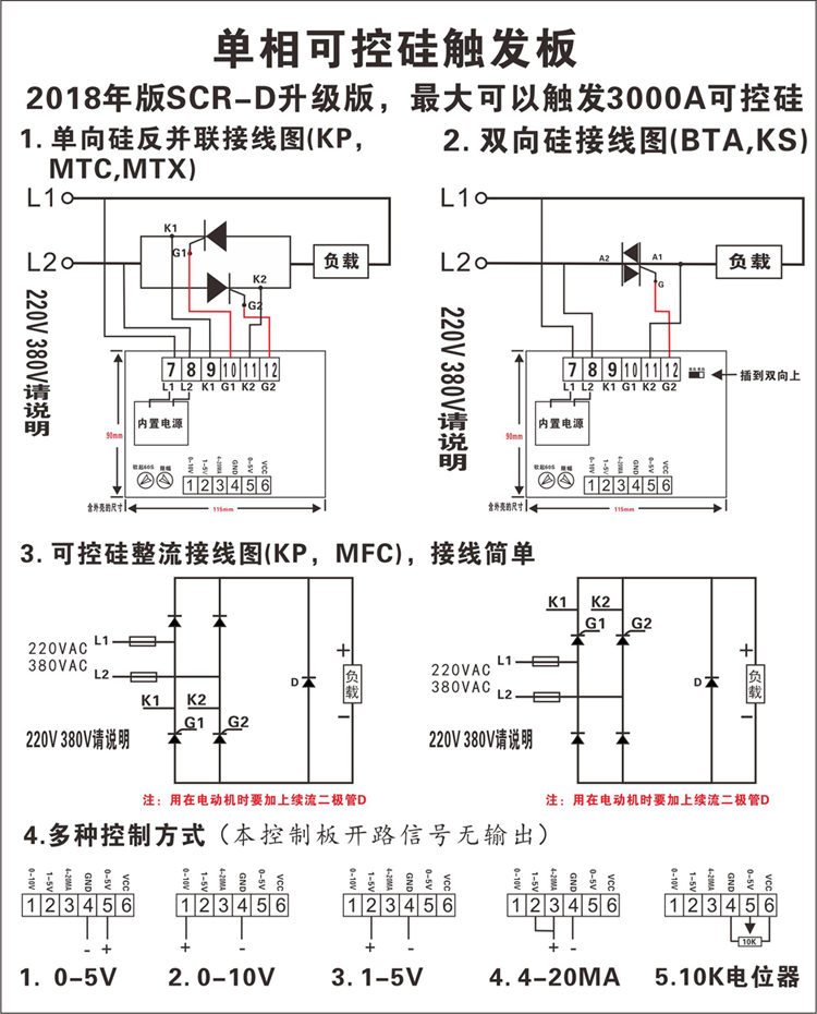 只要个信号:(多种控制信号输入:DC 4-20mA、DC 1-5V、DC 0-10V、10k电位器),就能给出线性输出,任意调温调速调压。可直接触发2000A以下的二只单向晶闸管。本控制板由高性能单片机作为控制、运算放大器、脉冲变压器等单元组成。可以与各种自动化仪表配套使用,对仪表无干扰,也可以外接电位器手动控制,广泛应用于负载要求连续平滑调节,拧制精度较高或不允许大电流冲击的控制系统。如交直流电机调速、调压、充电等。主要用于单相纯阻性负载、单相感性负载或变压器原边控制,如硅碳棒、硅钼棒、电阻丝等,也可用于单相或两相全桥半控整流,具有触发可靠,高精度,工作稳定,使用灵活的优点。