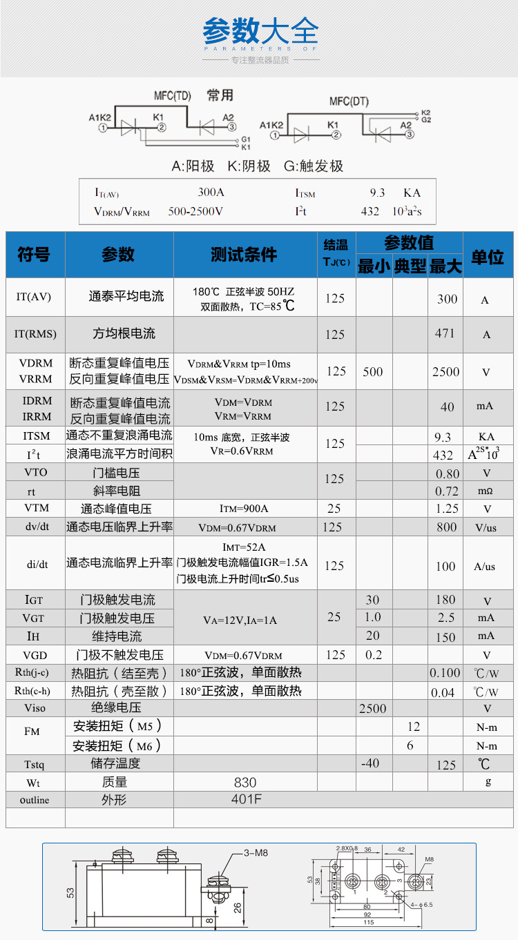 6、其它模块,这里指的是电焊机模块,分为整流以及可控两类,整流电焊机模块国内型号:MDG和MDY,其中MDG是共阳的,MDY是共阴的,电流50-300A,电压:100-1600V。电焊机可控模块国内型号:MTG(可控的电焊机模块只有共阳的),电流50-200A,电压:100-1600V。
